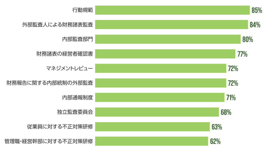 下図のとおり、不正が発生した時点でも、調査対象の不正組織では多くの不正対策が既に実施されていた。不正対策のベスト10は以下のとおりとなります。