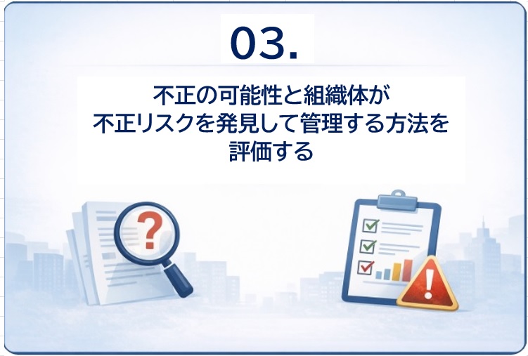 内部監査人は、不正リスク・マネジメントについて次の点を評価します。